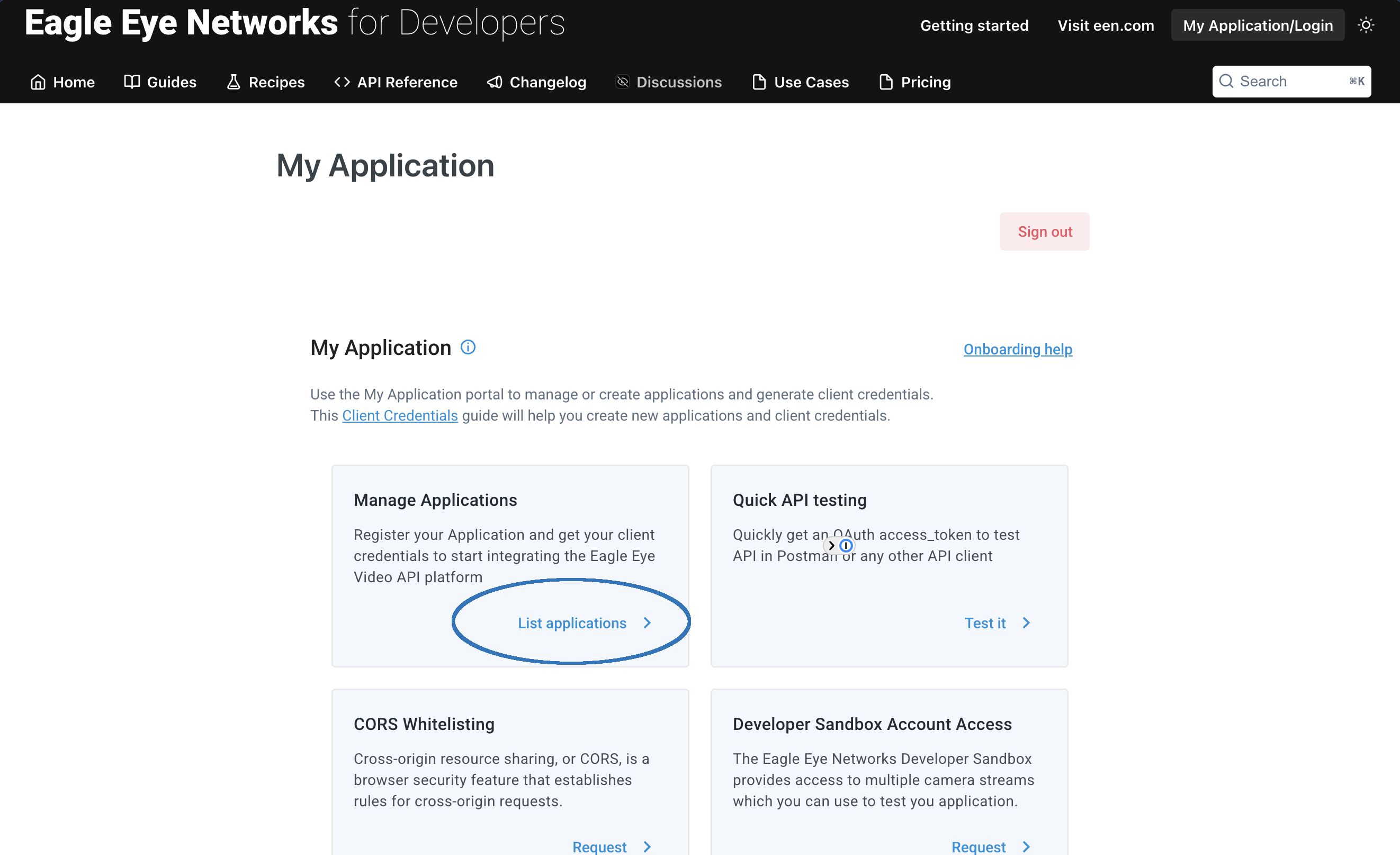 You can create a new application from the developer portal’s My Application page. From the dashboard, navigate to the Manage applications section and select "List applications".